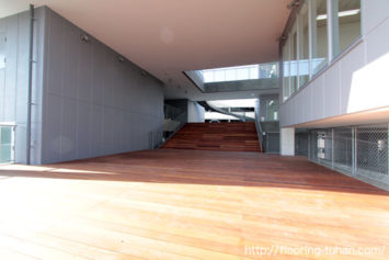 セランガンバツデッキ材(30×120×3900)とセランガンバツ90巾乱尺タイプ無塗装フローリング・面なしを専門学校のテラスへ使用。耐久性に優れているので、雨風や人の出入りの多い場所に最適な材を選び施工。