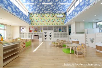 カバ桜無垢フローリング140巾集成4Pタイプ塗装品を保育園に使用。屋外には、子供たちが駆け回れるよう広いウッドデッキが設置されています。