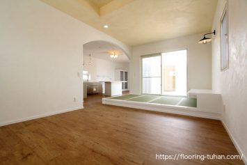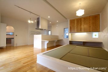 PVCフローリング(デコクリック)、カバ桜無垢フローリング90巾ユニタイプ塗装品・小節有をご採用いただいた沖縄県宜野座村の二世帯住宅。ペットを飼われている子世帯の床材には、ペット対応可能なデコクリック・ナチュラルティンバーカラーを使用しています。