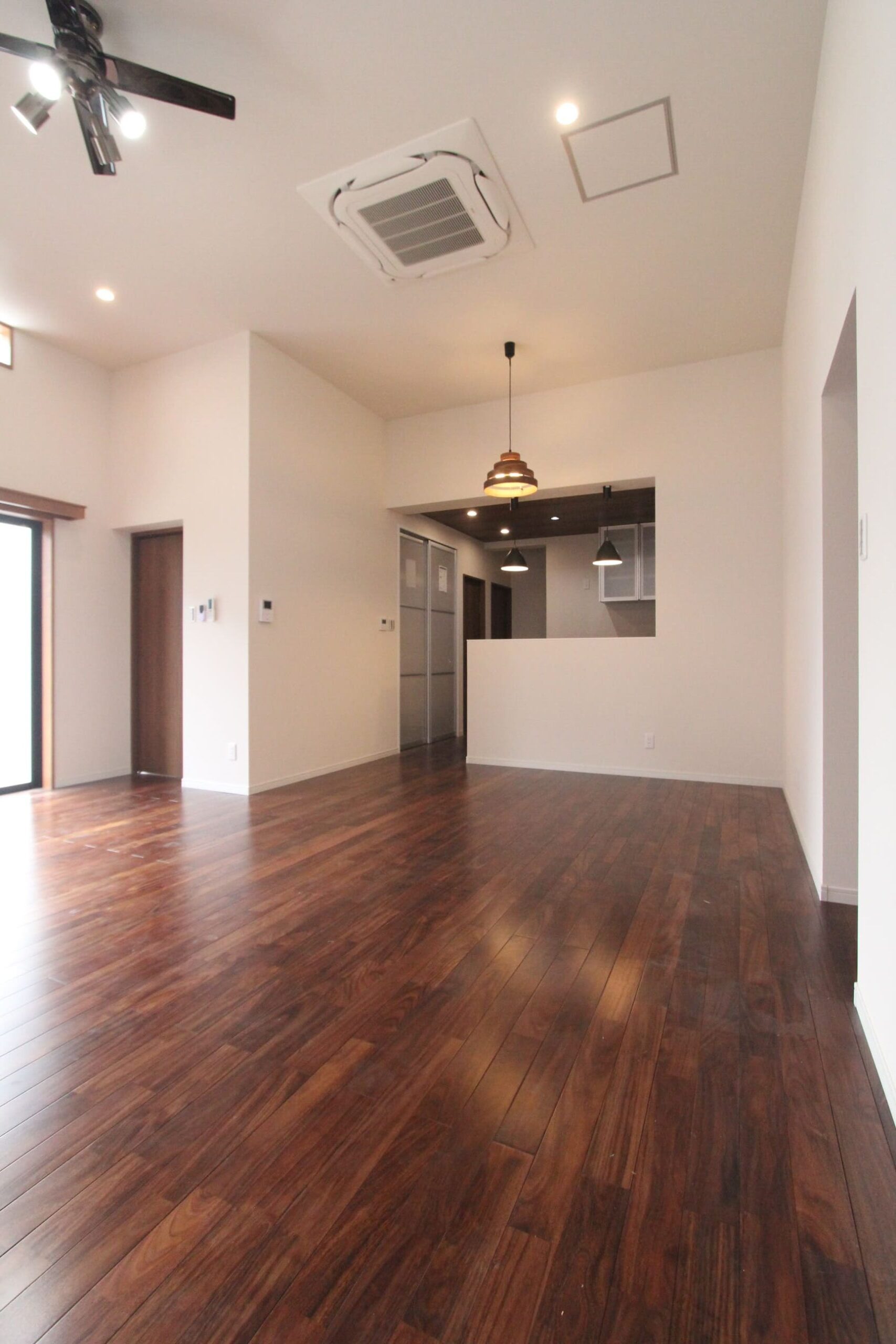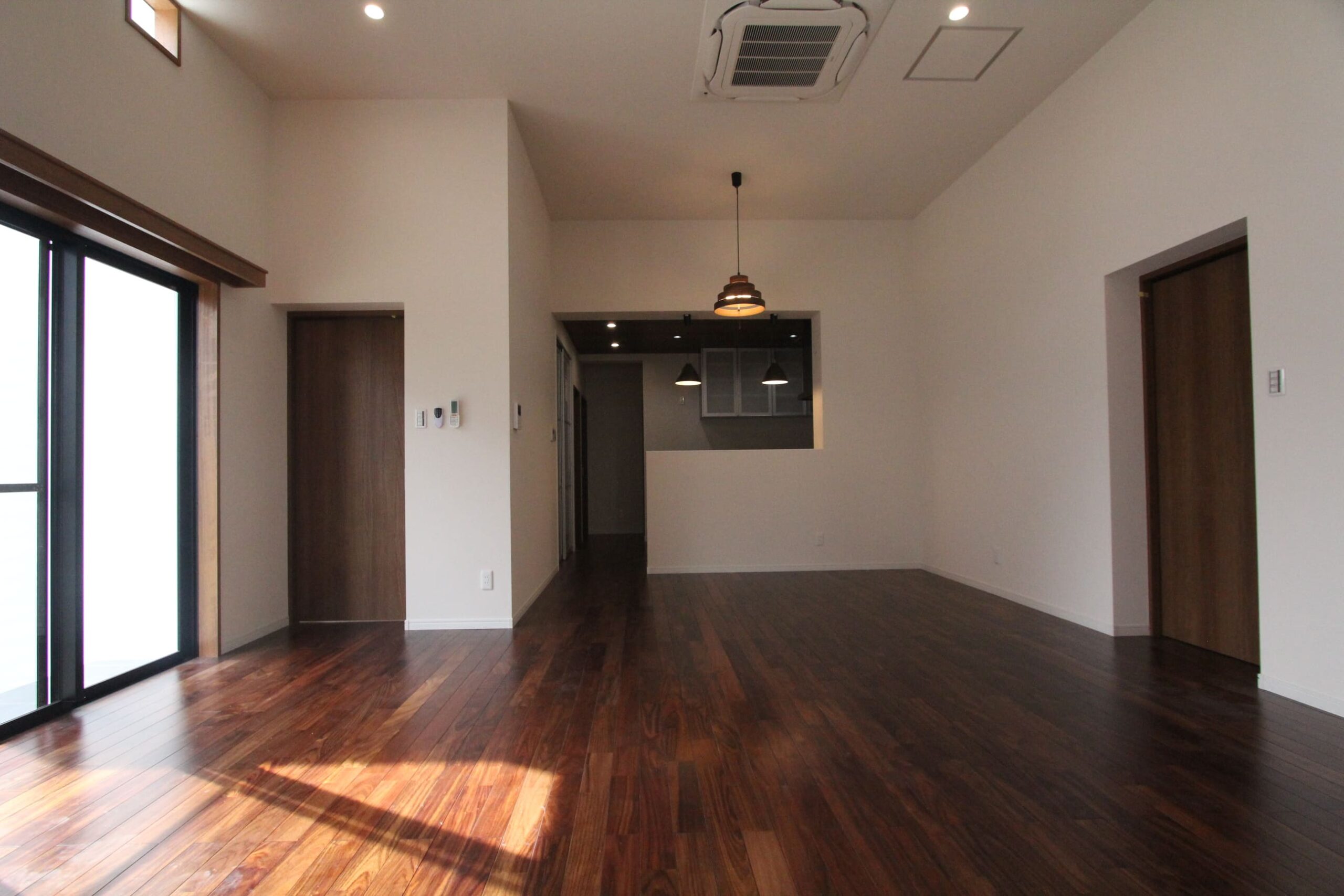 木目の存在感がしっかりとしているため、広いリビングや吹き抜け空間でも空間に負けない力強さを発揮。家具やアイアン素材とも相性が良く、シックで洗練されたインテリアコーディネートが可能です。