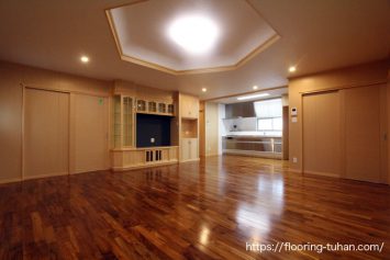 PVCフローリング(デコクリック)、カバ桜無垢フローリング90巾ユニタイプ塗装品・小節有をご採用いただいた沖縄県宜野座村の二世帯住宅。ペットを飼われている子世帯の床材には、ペット対応可能なデコクリック・ナチュラルティンバーカラーを使用しています。