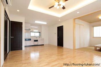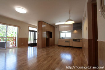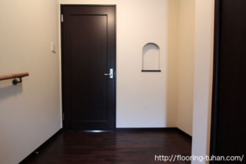 ローズウッド(紫檀)90巾集成3Pタイプ塗装品を新築2階2世帯住宅に採用。以前に行われた別の見学会で、ローズウッド(紫檀)の床材を気に入られた施主様が「ぜひ自分の住宅でも使いたい!」とのことでこの材を選ばれました。ローズウッド(紫檀)材は全体的に紫がかった色味で、室内で使用すると落ち着いた雰囲気となります。