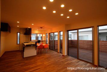 セランガンバツ・ウッドデッキ材105巾・20mm厚(リブ有)を増築2階住宅のテラス部分に使用。セランガンバツ材は、杉や松などに比べ耐久性が高く、高温多湿になりがちで、害虫の被害の可能性のある地域にはとても有効な材なのでウッドデッキ材の中では1番人気のデッキ材です。