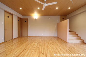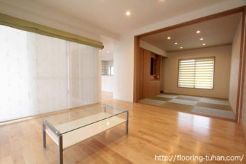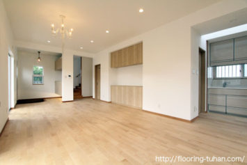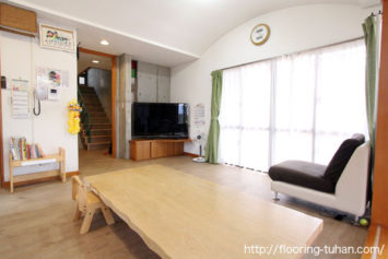 PVCフローリング(デコクリック)・ナチュラルティンバーカラーを2階建て住宅の床材として採用。今回はリフォームでしたので、既製品のチーク材の上にPVCフローリング(デコクリック)を施工しました。
